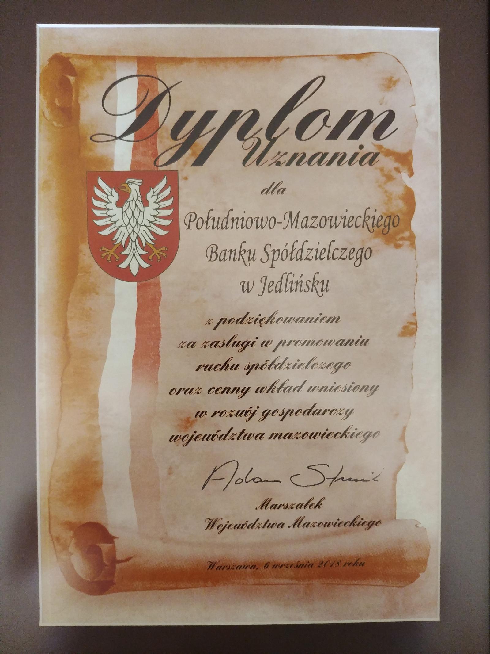W dniu 6 września br. Marszałek Województwa Mazowieckiego Pan Adam Struzik złożył na ręce dr Krzysztofa Sadurskiego - Prezesa Zarządu Południowo-Mazowieckiego Banku Spółdzielczego w Jedlińsku Dyplom Uznania dla banku, za jego wkład w promowanie ruchu spółdzielczego i rozwój gospodarczy województwa mazowieckiego.